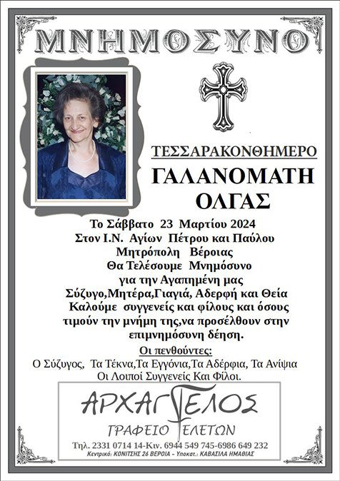 Τελείται το Σάββατο 23 Μαρτίου 2024 στον Ιερό Ναό Αγίων Πέτρου και Παύλου Μητρόπολη Βέροιας 40ΝΘΗΜΕΡΟ ΜΝΗΜΟΣΥΝΟ για την ανάπαυση της ψυχής της αγαπημένης μας συζύγου, μητέρας, γιαγιάς, αδελφής και θείας Όλγας Γαλανομάτη και καλούνται όλοι όσοι τιμούν τη μνήμη της να προσέλθουν και να ενώσουν μαζί μας τις δεήσεις τους προς το Θεό.