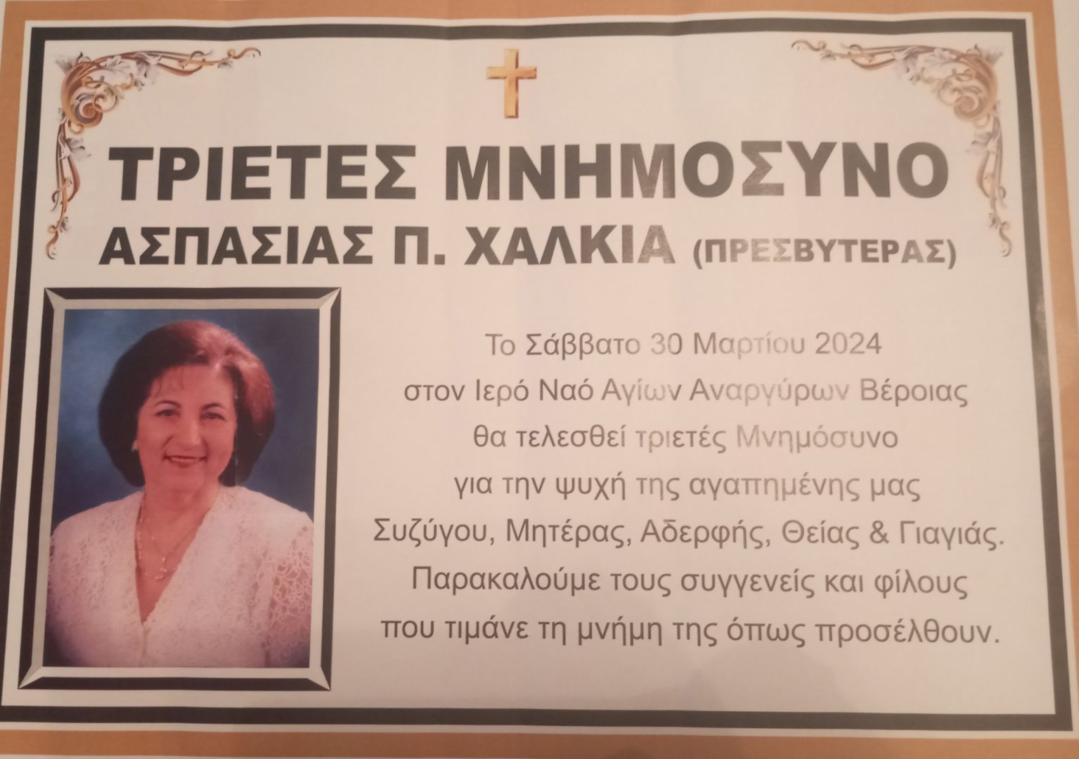 Τελείται το Σάββατο 30 Μαρτίου 2024 στον Ιερό Ναό Αγίων Αναργύρων Βέροιας ΤΡΙΕΤΕΣ ΜΝΗΜΟΣΥΝΟ για την ανάπαυση της ψυχής της αγαπημένης μας συζύγου, μητέρας, γιαγιάς, αδελφής και θείας ΑΣΠΑΣΙΑΣ Π. ΧΑΛΚΙΑ (Πρεσβυτέρας) και καλούμε όλους όσοι τιμούν τη μνήμη της να προσέλθουν και να ενώσουν μαζί μας τις δεήσεις τους προς το Θεό.