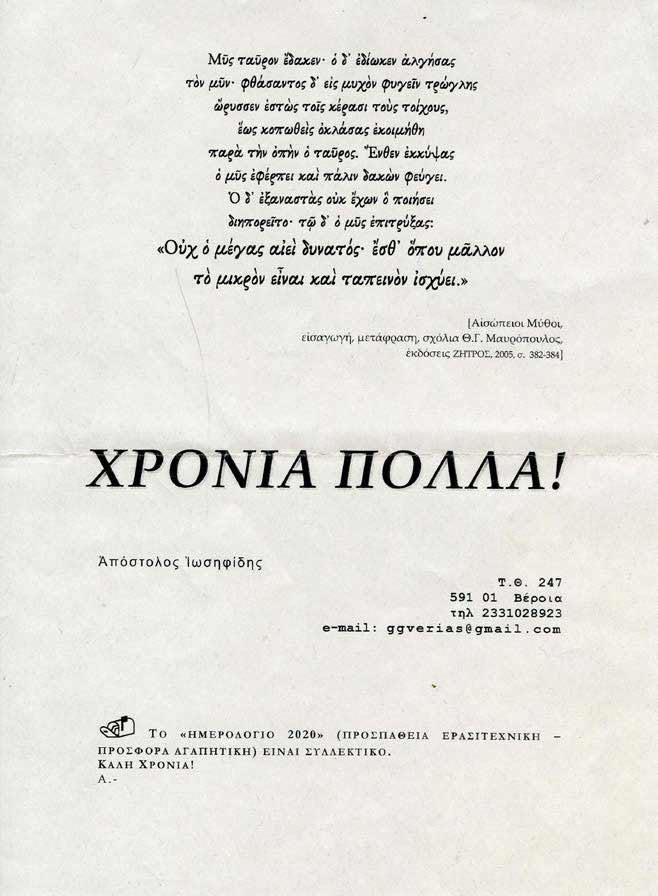 Ο Απόστολος Ιωσηφίδης με το Ημερολόγιο 2020 τιμά τον δάσκαλό του Θωμά Γαβριηλίδη και με την καταγραφή των εργασιών του στο εσωτερικό του οπισθόφυλλου του Ημερολογίου.