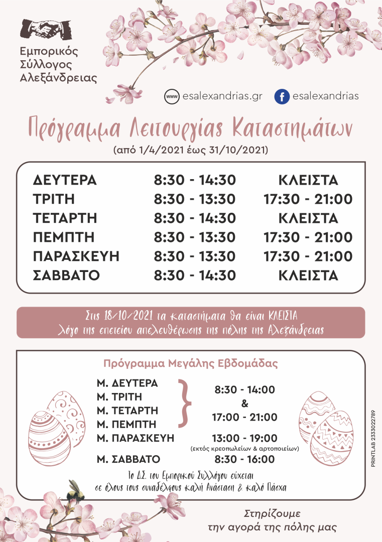 Ο Εμπορικός Σύλλογος Αλεξάνδρειας ανακοίνωσε το θερινό και εορταστικό ωράριο λειτουργίας του Πάσχα.