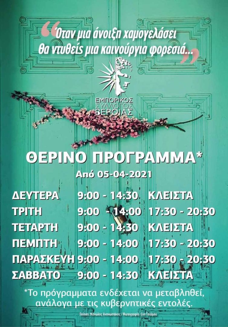 Ο Εμπορικό Σύλλογος Βέροιας ανακοίνωσε το θερινό πρόγραμμα των καταστημάτων για το 2021.