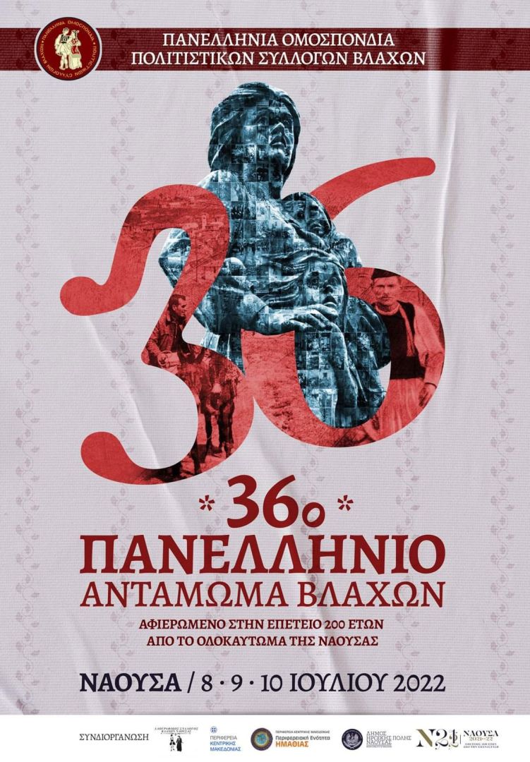 Με τη συμμετοχή 1.500 χορευτών θα πραγματοποιηθεί τον Ιούλιο στη Νάουσα (8,9 και 10 Ιουλίου) το 36ο Πανελλήνιο Αντάμωμα Βλάχων, το οποίο θα είναι αφιερωμένο στη 200η επέτειο από το Ολοκαύτωμα της πόλης.