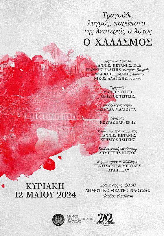 Στο πλαίσιο των εκδηλώσεων της 202ης Επετείου Ολοκαυτώματος της πόλης, ο Δήμος Ηρωικής Πόλης Νάουσας διοργανώνει την Κυριακή 12 Μαΐου 2024 και ώρα 20:00 στο Δημοτικό Θέατρο Νάουσας «Μίκης Θεοδωράκης» την επετειακή συναυλία «Τραγούδι, λυγμός, παράπονο της λευτεριάς ο λόγος… ο Χαλασμός» με ελεύθερη είσοδο για το κοινό.