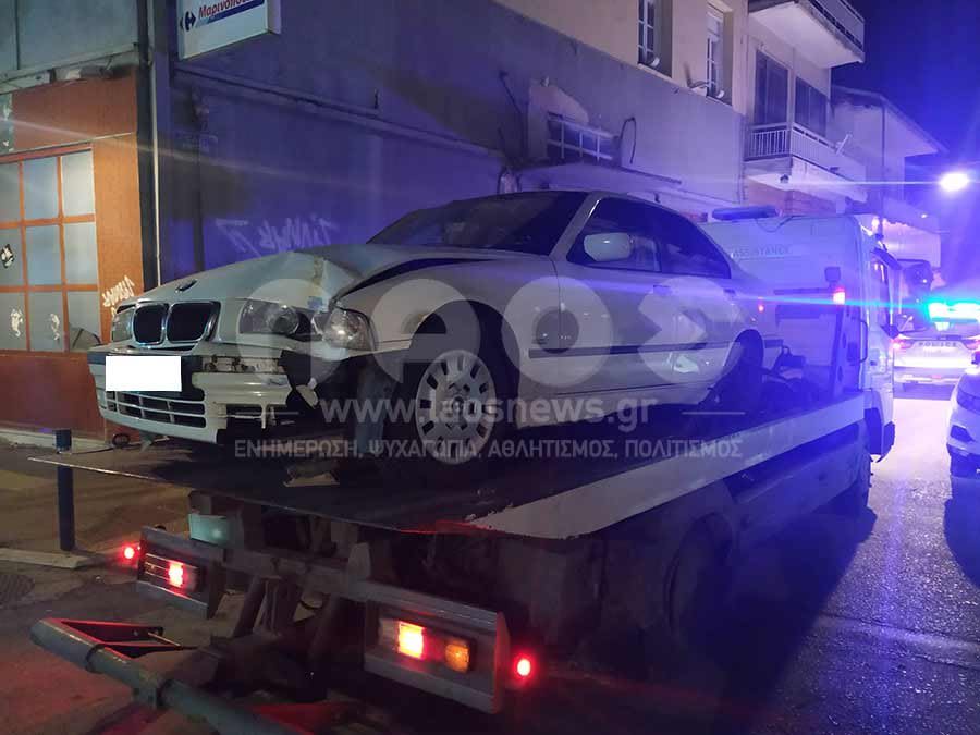 Από την ισχυρή σύγκρουση των οχημάτων, το λευκό BMW καβάλησε το πεζοδρόμιο και κατέληξε να μπει στο βιβλιοπωλείο ΠΥΡΙΝΟΣ.