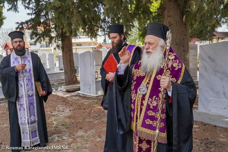 Στην συνέχεια ο Σεβασμιώτατος μετέβη στο Κοιμητήριο της Βεροίας, όπου μαζί με τους εφημερίους τέλεσε Τρισάγιο για την ανάπαυση πάντων των κεκοιμημένων της επαρχίας μας, καθώς τα οικεία τους πρόσωπα είναι αδύνατον να μεταβούν στα Κοιμητήρια, όπως συνηθίζεται τέτοια ημέρα, λόγω των έκτακτων κυβερνητικών μέτρων.