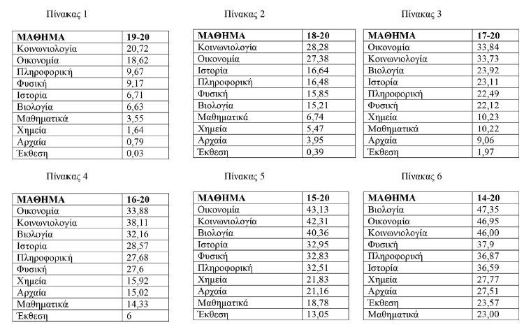 Οι πίνακες που ακολουθούν (1,2,3,4,5,6) παρουσιάζουν την κατάταξη των μαθημάτων κατά βαθμό «δυσκολίας», όπως αυτός «τεκμαίρεται» από τα ποσοστά που εξέδωσε το Υπουργείο Παιδείας.