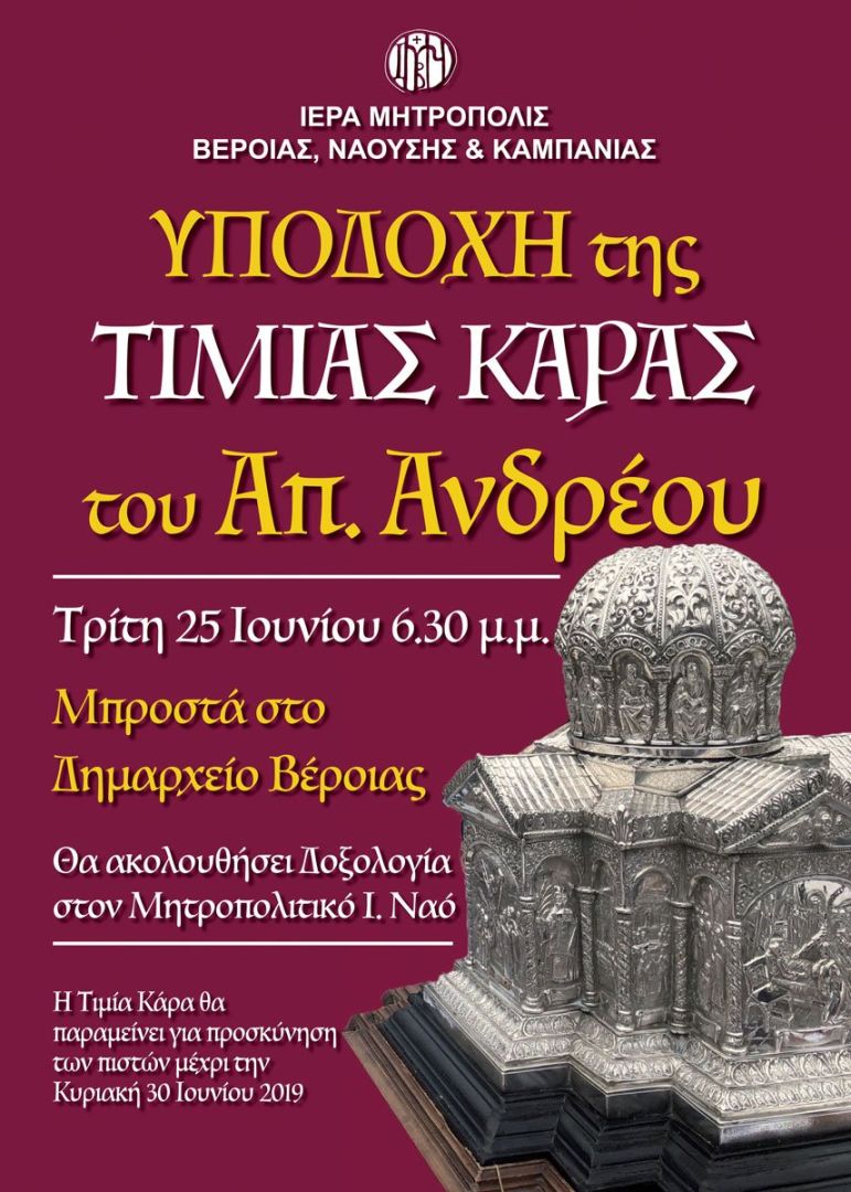 Την Τρίτη 25 Ιουνίου στις 6:30 μ.μ. μπροστά από το Δημαρχείο της Βέροιας θα πραγματοποιηθεί η Υποδοχή της Τιμίας Κάρας του Αποστόλου Ανδρέου και στην συνέχεια θα τελεστεί Δοξολογία στον Μητροπολιτικό Ιερό Ναό των Αγίων Αποστόλων Πέτρου και Παύλου Βεροίας