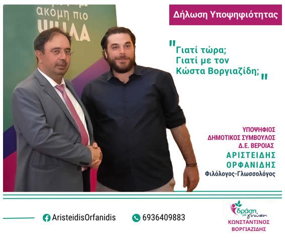 Την υποψηφιότητά του ως δημοτικός σύμβουλος Βέροιας στις επικείμενες εκλογές του Οκτωβρίου, με τον συνδυασμό του Κώστα Βοργιαζίδη «Δράση με Γνώση», ανακοίνωσε ο Άρης (Αριστείδης) Ορφανίδης, πρόεδρος του Ομίλου Φίλων Θεάτρου & Τεχνών Βέροιας και Υπεύθυνος Επικοινωνίας & Δημοσίων Σχέσεων του Τουριστικού Ομίλου Βέροιας, φιλόλογος-γλωσσολόγος, τονίζοντας τα εξής: