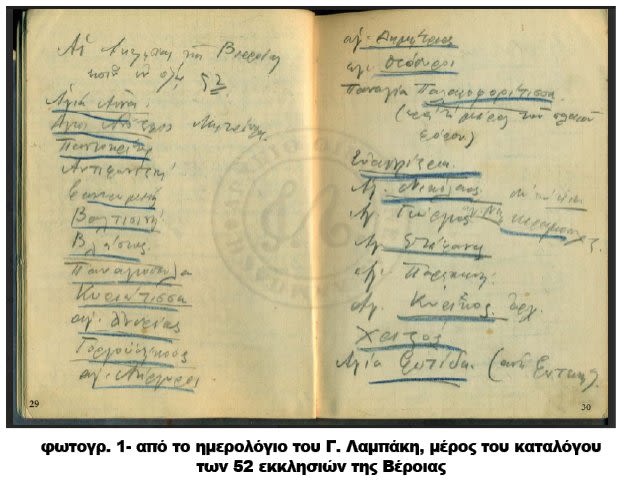 «Αἱ ἐκκλησίαι τῆς Βερροίας εἰσὶν ἐν ὅλω 52 Ἁγία Ἄννα, Ἅγιοι Ἀπόστολοι Μητρόπολις, Παντοκράτωρ, Ἀντιφωνητής, Φανερωμένη, Βαλτισινή, Βλάσιος, Παναγιωπούλα, Κυριώτισσα, Ἁγ. Ἀνδρέας, Γοργοϋπήκοος, ἅγ. Ἀνάργυροι, ἅγ. Δημήτριος, ἅγ. Θεόδωροι, Παναγία Παλαιοφορίτισσα (παρὰ τὸ μέρος τοῦ παλαιοῦ φόρου), Εὐαγγελίστρια, Ἅγ. Νικόλαος δὲν τὸν εἶδα, Ἅγ. Γεώργιος, Ἅγ. Στέφανος, Ἁγ. Παρασκευή, Ἅγ. Κύρικος ἀρχ., Χριστός, Ἁγία Φωτίδα (ἀντί Φωτεινῆς), Ἅγ. Νικόλαος Γούρνας, Ἅγ. Νικόλαος ξυλοτραβηχτὴς ὅταν τὸν ἔκτιζαν δὲν ἔφτανε τὸ ξύλον ποὺ στοίβαζαν, Ἅγ. Ἰωάννης ὁ Ἐλεήμων, Χρυσοπολίτισσα, Ἁγία Ἄννα, Προφήτης Ἠλίας, ἅγ. Νικόλαος, ἅγ. Πατάπιος, Ἡ Μεταμόρφωσις, Ἅγιοι Ἀνάργυροι, Ἅγ. Βασίλειος, Κυριώτισσα, Περίβλεπτος, ἁγία Ἄννα, ἁγ. Βαρβάρα, ἅγ. Βασίλειος, Ἅγ. Ἀντώνιος, Μέγας Θεολόγος (Ἰω.<άννης> ὁ εὐαγγ.<ελιστής>), Ἅγιος Νικόλαος, ἅγιος Γεώργιος, Παναγία Χαβιαρᾶ, Προκόπιος, Ἔξω Παναγιά, ἅγ. Νικόλαος, Σπυρίδων, Γεώργιος, Ἀνδρέας, Παρασκευή, Δεξιά, ἅγ. Νικόλαος» {φωτογρ. 1}
