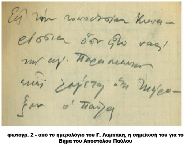 …όπου ιδιαίτερα μνημονεύει (αποτυπώνοντας βαθύτατα ριζωμένη παράδοση και εδραία πεποίθηση της τοπικής κοινωνίας, διατρανούμενη μάλιστα, μετά από 500 χρόνια οθωμανικής κατοχής, εν μέσω των τουρκικών συνοικιών της πόλης, με την ελληνική ονομασία της περιοχής) το Βήμα του Αποστόλου Παύλου…