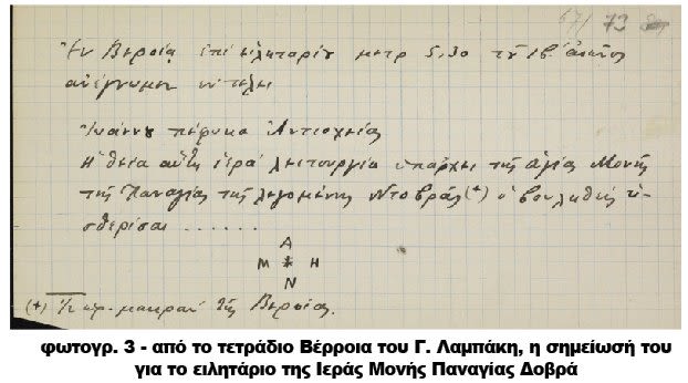 …ενώ σε άλλο, αυτοτελές τετράδιό του, αντιγράφει, με προσοχή, επιγραφές τοιχογραφιών, φορητών εικόνων, λειτουργικών βιβλίων κλπ, που εντοπίζει στους Ναούς της Βέροιας. {φωτογρ. 3}