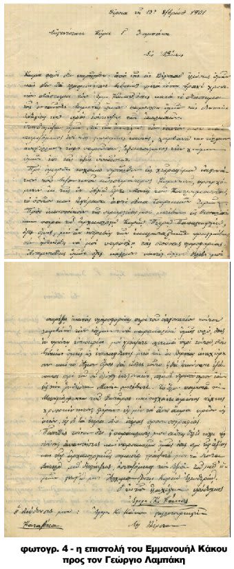 Δεν είναι γνωστό (και δεν φαίνεται να προκύπτει από το αρχείο Λαμπάκη) αν απαντήθηκε η επιστολή του Εμμ. Κάκου.