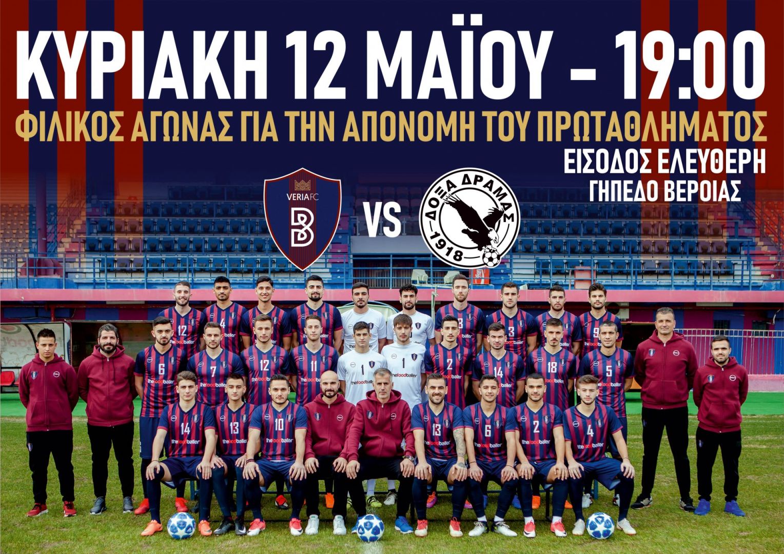 Σας προσκαλούμε, την Κυριακή 12 Μαΐου, στις 7 μμ, στην φιλική αναμέτρηση του Ποδοσφαιρικού Συλλόγου «Βέροια» με την Δόξα Δράμας, στο Δημοτικό Στάδιο Βέροιας για να γιορτάσουμε όλοι μαζί την άνοδο της ομάδας μας στην μεγαλύτερη κατηγορία.Στο τέλος της αναμέτρησης, θα γίνει η απονομή πρωταθλήματος του 2ου ομίλου της Γ’ Εθνικής.