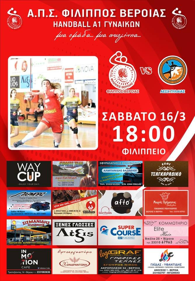 Την γυναικεία ομάδα χάντμπολ της Πυλαίας υποδέχεται το Σάββατο 16 Μαρτίου στο ΦΙΛΙΠΠΕΙΟ η αντίστοιχη του Φιλίππου στα πλαίσια της 14ης αγωνιστική της Α1 κατηγορίας.