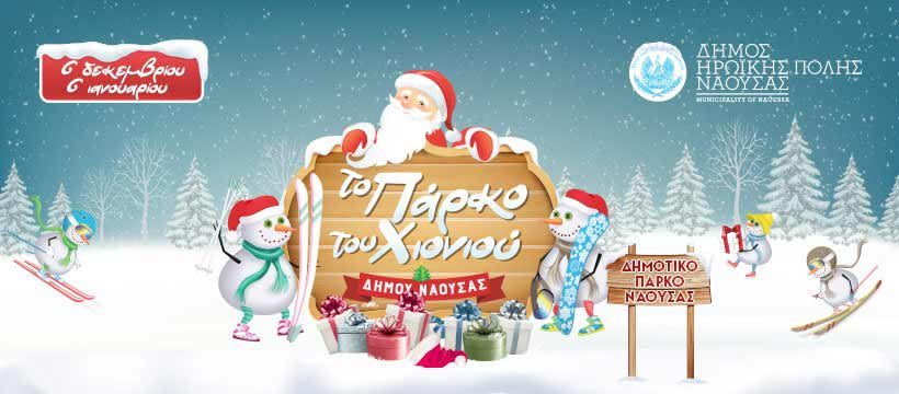Δημοτικό Πάρκο, ώρα 20:30 «Το Πάρκο του Χιονιού», έναρξη λειτουργίας με μουσική από τη Φιλαρμονική Εταιρία Νάουσας, του τμήματος κρουστών του Ωδείου «Αριστοτέλης» και χορευτικό από τον πολιτιστικό σύλλογο «Bodycontrol». Ελάτε να ζήσουμε τη μαγεία των Χριστουγέννων με πολλές εκπλήξεις (παγοδρόμιο, escaperoom, arenafortnite, facepainting, ανιματέρ, ξυλοπόδαρους, σπίτι του Αϊ Βασίλη κλπ.).