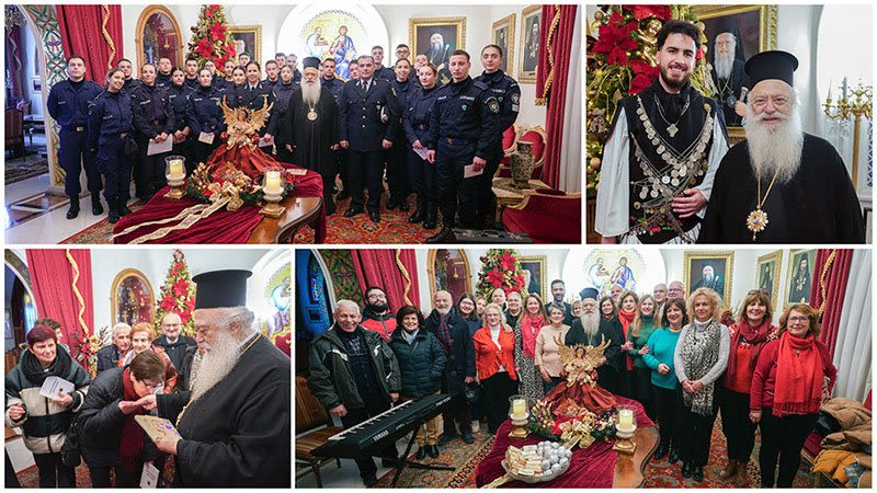 Οι καλαντιστές μετέφεραν το χαρμόσυνο μήνυμα της Γεννήσεως του Χριστού μέσα από τους μελωδικούς ήχους των χριστουγεννιάτικων καλάντων από τις διάφορες περιοχές της Ελλάδος και έλαβαν από τον Σεβασμιώτατο Μητροπολίτη μας κ. Παντελεήμονα ένα ενθύμιο και ένα μοναστηριακό γλύκισμα.