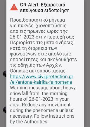 Προειδοποιητικό μήνυμα για πυκνές χιονοπτώσεις από τις πρωινές ώρες της 26-01-2023 στην περιοχή σας. Περιορίστε τις μετακινήσεις κατά την διάρκεια των φαινομένων