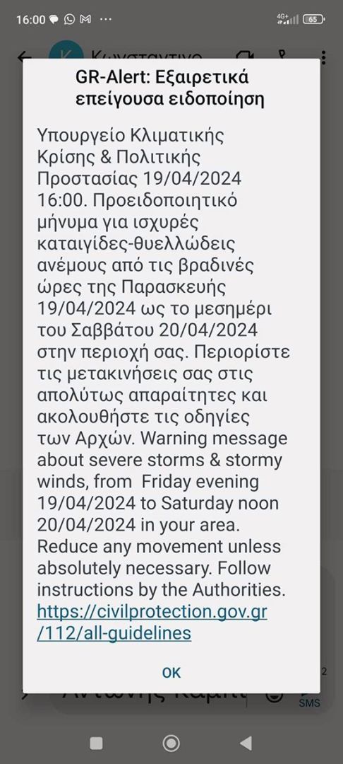 Στις 4 το απόγευμα της Παρασκευής(19/4/2024) τα κινητά κατοίκων σε πολλά μέρη της Ελλάδας, αλλά και στη Βέροια έλαβαν το γνωστό προειδοποιητικό μήνυμα του 112. Το υπουργείο Κλιματικής Κρίσης και Πολιτικής Προστασίας έστειλε εξαιρετικά επείγουσα ειδοποίηση για εκδήλωση ισχυρών καταιγίδων με θυελλώδεις ανέμους που θα διαρκέσουν από το βράδυ της Παρασκευής μέχρι το μεσημέρι του Σαββάτου(20/4) στην περιοχή μας. Το μήνυμα συστήνει να περιορίσουν οι πολίτες τις μετακινήσεις στις απολύτως απαραίτητες.