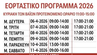 Κυριακή των Βαϊων προτεινόμενο ωράριο 11.00 π.μ. - 15.00 μ.μ.Μ. Δευτέρα 6/4/2026 9.00 π.μ. - 14.00 μ.μ. και 17.00 μ.μ. - 21.00...