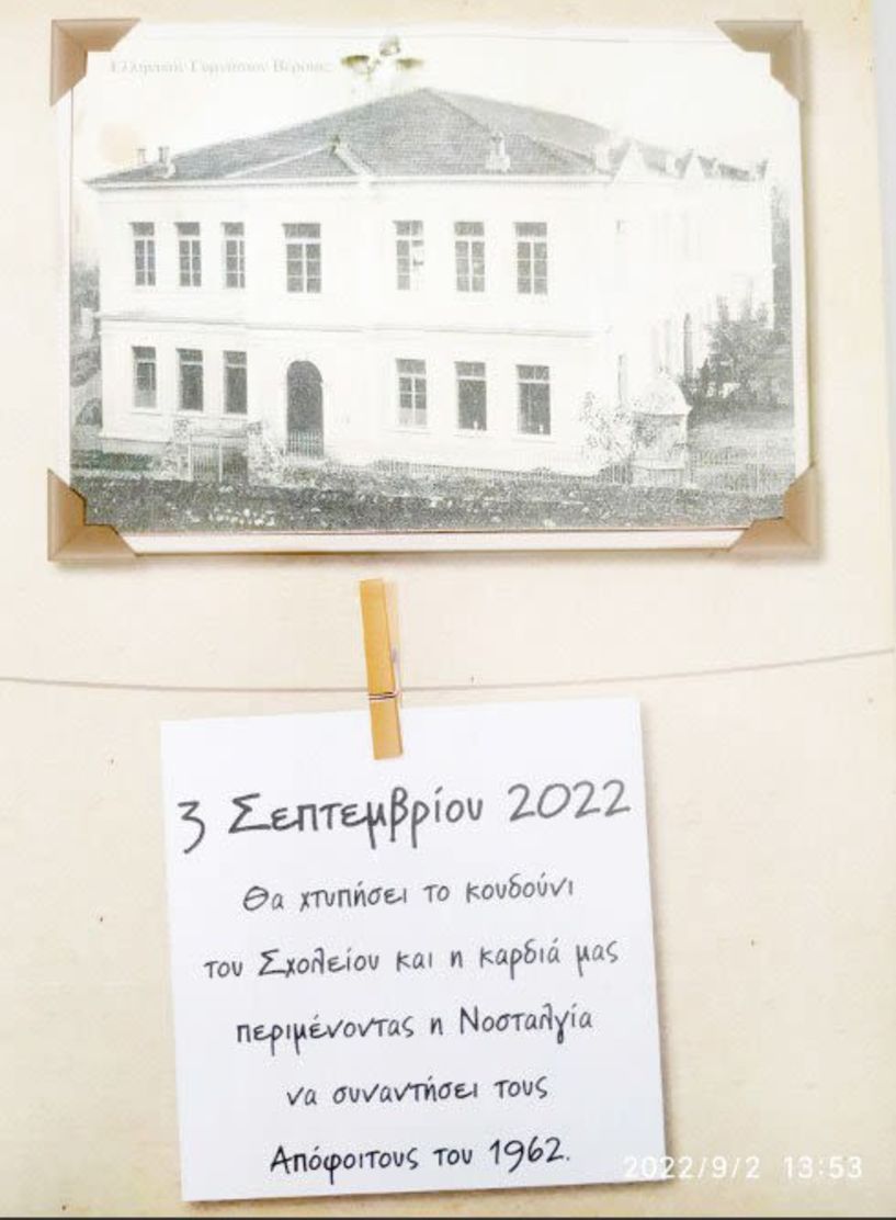 «Σήμερα 3 Σεπτεμβρίου 2022, θα χτυπήσει το κουδούνι του σχολείου μας και η καρδιά μας, περιμένοντας η Νοσταλγία να συναντήσει τους Απόφοιτους του 1962».