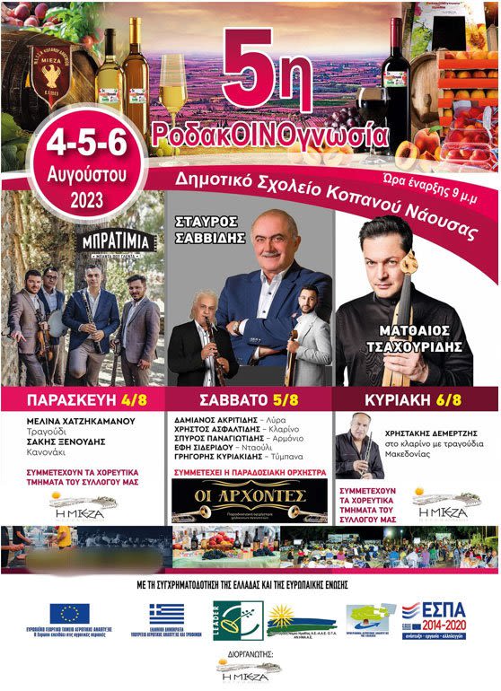 Στις παράλληλες δράσεις του Φεστιβάλ συμπεριλαμβάνονται γευστικές δοκιμές και γαστρονομικές αποδράσεις με συνταγές βασισμένες στο ροδάκινο και στον οίνο , οινογνωσία και γνωριμία με τοπικές ποικιλίες κρασιού σε συνεργασία με οινοποιεία της περιοχής μας , ξενάγηση στον αρχαιολογικό χώρο της Μίεζας, εκπαιδευτικά προγράμματα και δράσεις για παιδιά , παρουσίαση νεανικών σχημάτων του Συλλόγου. . Σας καλούμε σε ένα ξεχωριστό τριήμερο , σε μια Γιορτή της Παράδοσης που τα έχει όλα και που ετοιμάσαμε με πολύ αγάπη και μεράκι , με σκοπό να ταξιδέψουμε μέσω της μουσικής σε κάθε άκρη της Ελλάδας και ταυτόχρονα να τιμήσουμε τα δύο σπουδαιότερα προϊόντα της περιοχής μας : το ροδάκινο και τον οίνο.