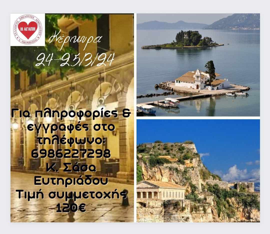 Ο Σύλλογος Εθελοντών Αιμοδοτών Νέας Νικομήδειας σε συνεργασία με το ταξιδιωτικό γραφείο Pi Ke Fi διοργανώνει Διήμερη εκδρομή στην Κέρκυρα 24 με 25 Μαρτίου 2024.
