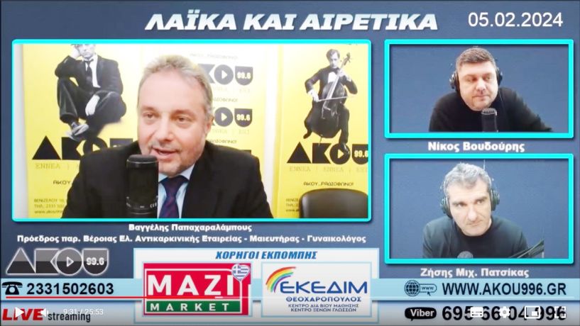 Με αφορμή την 4η Φεβρουαρίου, παγκόσμια ημέρα κατά του καρκίνου, η ραδιοφωνική εκπομπή Λαϊκά&Αιρετικά του ΑΚΟΥ 99.6 είχε καλεσμένο το μεσημέρι της Δευτέρας(05/2/2024) τον Βαγγέλη Παπαχαραλάμπους, μαιευτήρα-γυναικολόγο και πρόεδρο του παραρτήματος Βέροιας της Ελληνικής Αντικαρκινικής Εταιρείας. Ο κ. Παπαχαραλάμπους επεσήμανε την σημασία της πρόληψης, αλλά και της υιοθέτησης ενός πιο υγιεινού τρόπου ζωής, με σωστή διατροφή, άσκηση και τρόπους διαφυγής από το στρες για να μειώσουμε τις πιθανότητες εμφάνισης του καρκίνου.