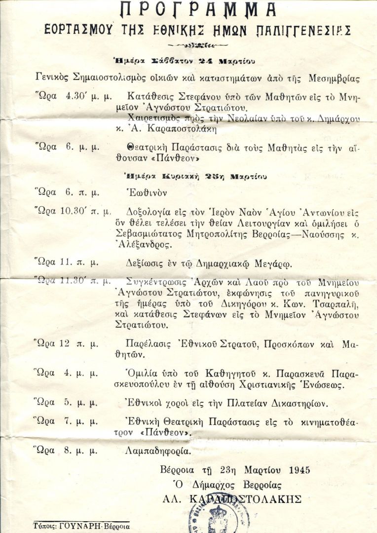 1945, σαν σήμερα, 23 Μαρτίου και ο Δήμαρχος της πόλης μας Αλ. Καραποστολάκης ανακοινώνει το πρόγραμμα του Εορτασμού. Κατάθεση στεφάνου στο μνημείο «Αγνώστου Στρατιώτη». Ίσως η μοναδική φορά που αναφέρεται έτσι το Ηρώο Πεσόντων. Πληθώρα εκδηλώσεων για να τιμηθεί η Εθνικής μας Παλιγγενεσία.