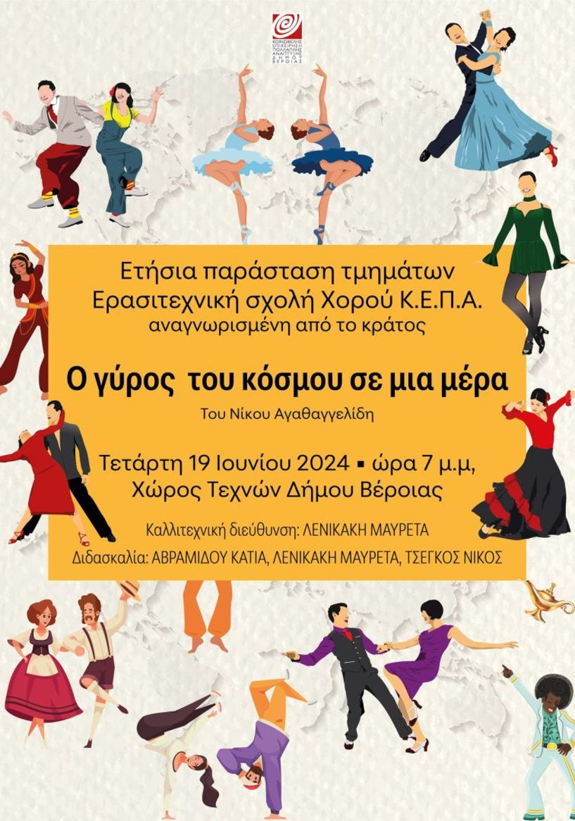 Την ετήσια παράστασή τους πραγματοποιούν τα τμήματα της σχολής Χορού της ΚΕΠΑ Δήμου Βέροιας, την Τετάρτη 19 Ιουνίου στις 7.00 μ.μ. Η εκδήλωση θα γίνει στον Χώρο Τεχνών και το θέμα της βασίζεται σε μια πρωτότυπη ιστορία του Νίκου Αγαθαγγελίδη, που έγραψε και τα κείμενα. Την καλλιτεχνική διεύθυνση έχει η δασκάλα χορού Μαυρέτα Λενικάκη, την διδασκαλία και τις χορογραφίες, οι: Κάτια Αβραμίδου, Μαυρέτα Λενικάκη και Νίκος Τσέγκος.