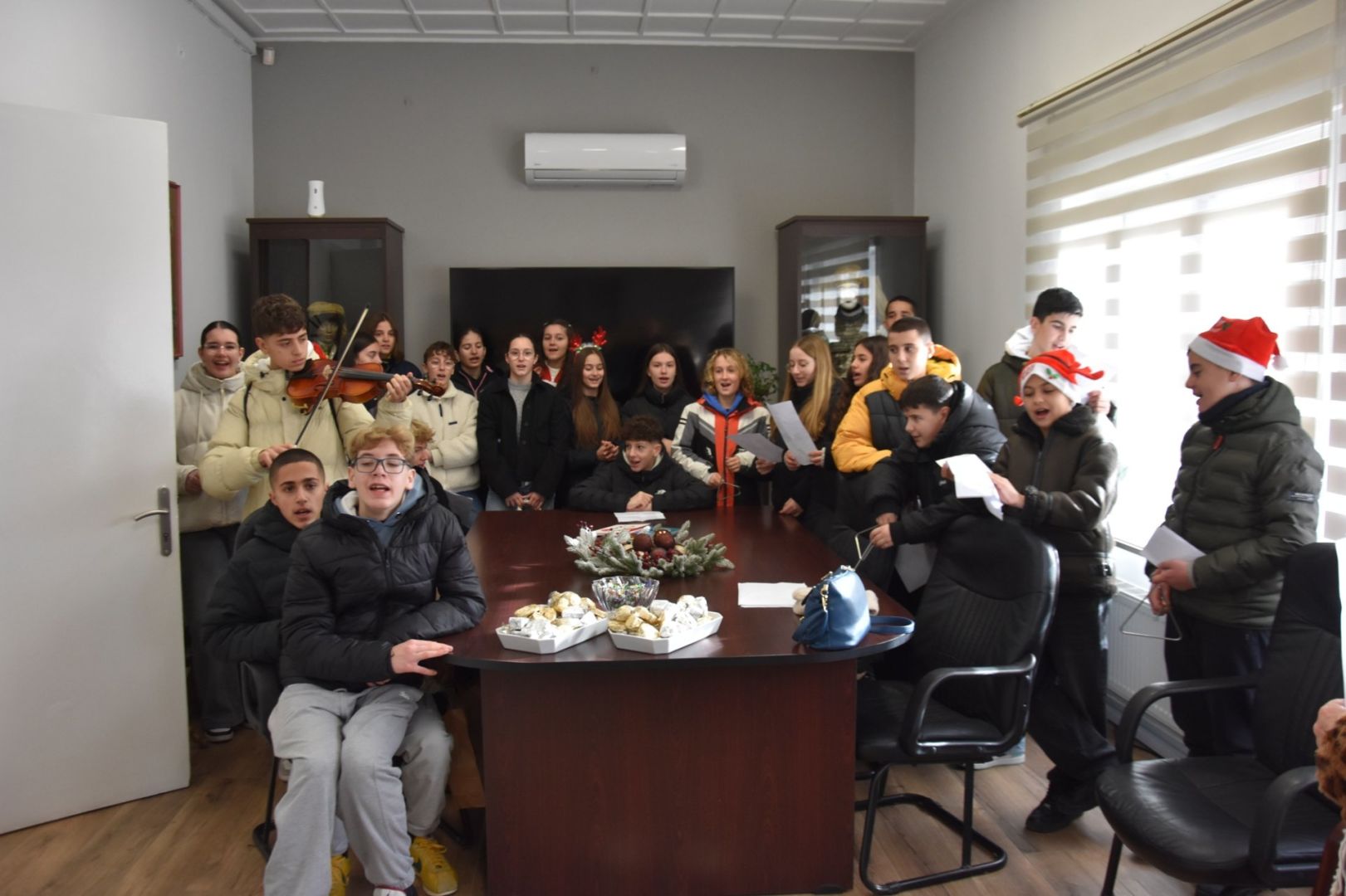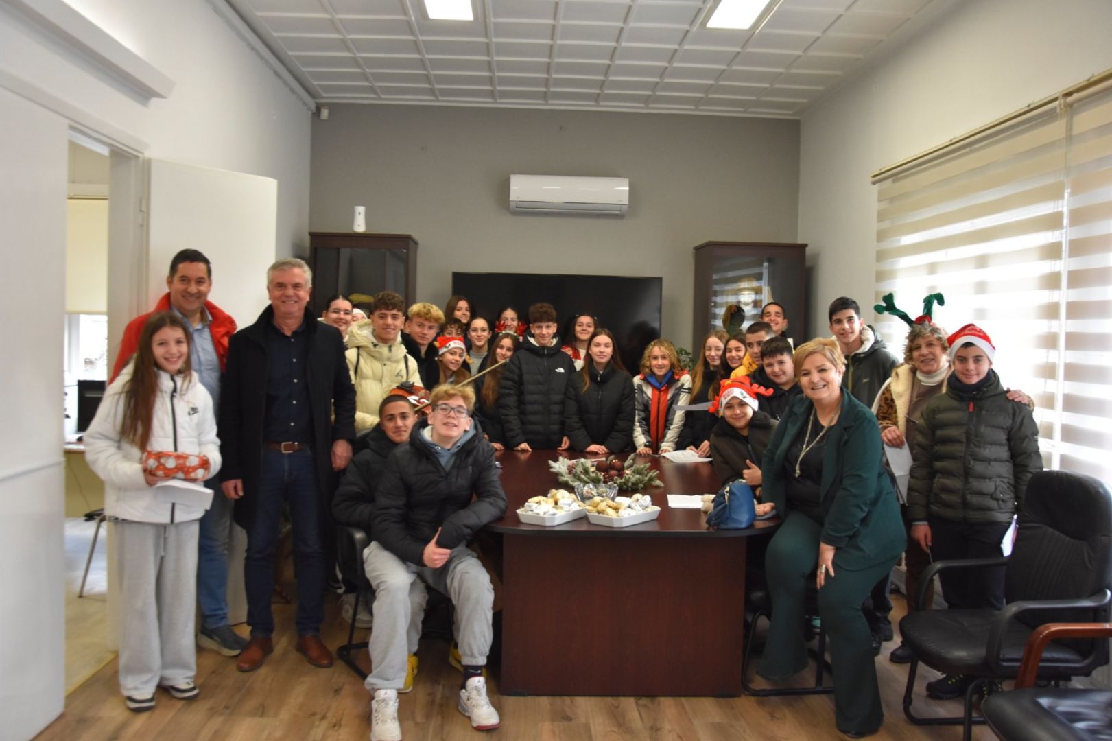 Τους υποδέχθηκαν, ο Δήμαρχος κ. Νίκος Κουτσογιάννης οι Αντιδήμαρχοι κα Άννα Ασλανίδου, κα Άννα Βασιλειάδου και κ. Στέλιος Δάγγας και η δημοτική σύμβουλος κα Ταμάρα Λογγινίδου, οι οποίοι τους ευχήθηκαν χρόνια πολλά, καλές γιορτές και τους μοίρασαν χριστουγεννιάτικα γλυκίσματα.