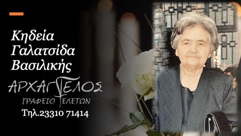 Έφυγε από τη ζωή και κηδεύτηκε σήμερα Σάββατο 4 Ιανουαρίου 2025 στις 4.00 μ.μ. από τον Ιερό Ναό Αγίου Δημητρίου Τρίκαλα Ημαθίας, η Βασιλική Γαλατσίδα σε ηλικία 90 ετών.