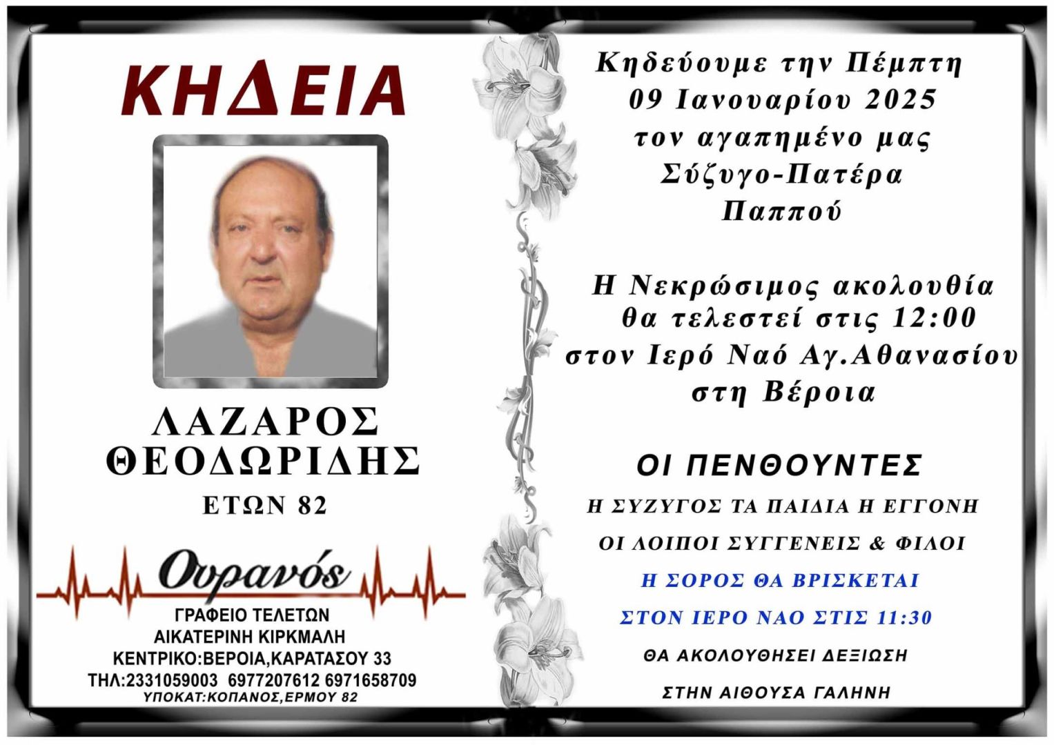 Έφυγε από τη ζωή και κηδεύεται την Πέμπτη 9 Ιανουαρίου 2025 στις 12.00 μ.μ. από τον Ιερό Ναό Αγίου Αθανασίου (Κοιμητήρια) Βέροιας ο Λάζαρος Θεοδωρίδης σε ηλικία 82 ετών.