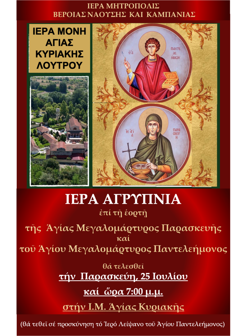 Ιερά Αγρυπνία θα τελεσθεί στην Ιερά Μονή Αγίας Κυριακής Λουτρού την Παρασκευή 25 Ιουλίου και ώρα 19:00, επί τη εορτή των Αγίων Μεγαλομαρτύρων Παντελεήμονος και Παρασκευής.