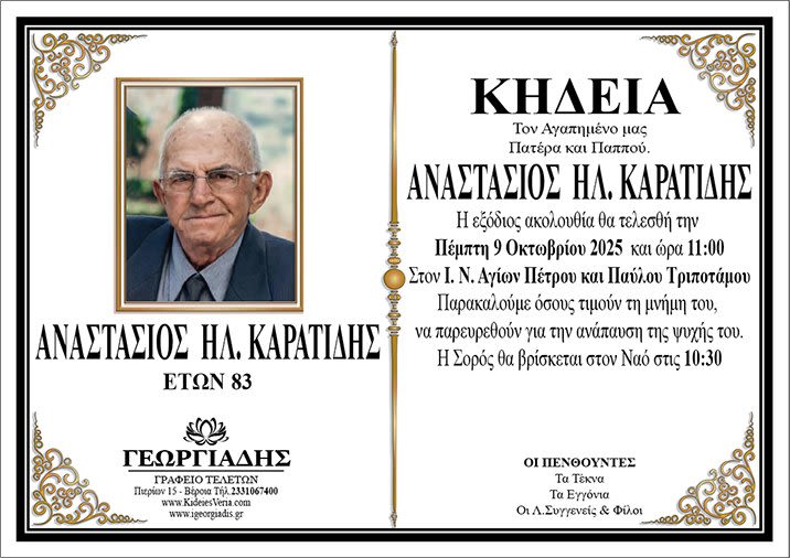 Έφυγε από τη ζωή και κηδεύεται την Πέμπτη 9 Οκτωβρίου 2025 στις 11.00 π.μ. από τον Ιερό Ναό Αγίων Πέτρου και Παύλου Τριποτάμου ο Αναστάσιος ο Ηλ. Καρατίδης σε ηλικία 83 ετών.