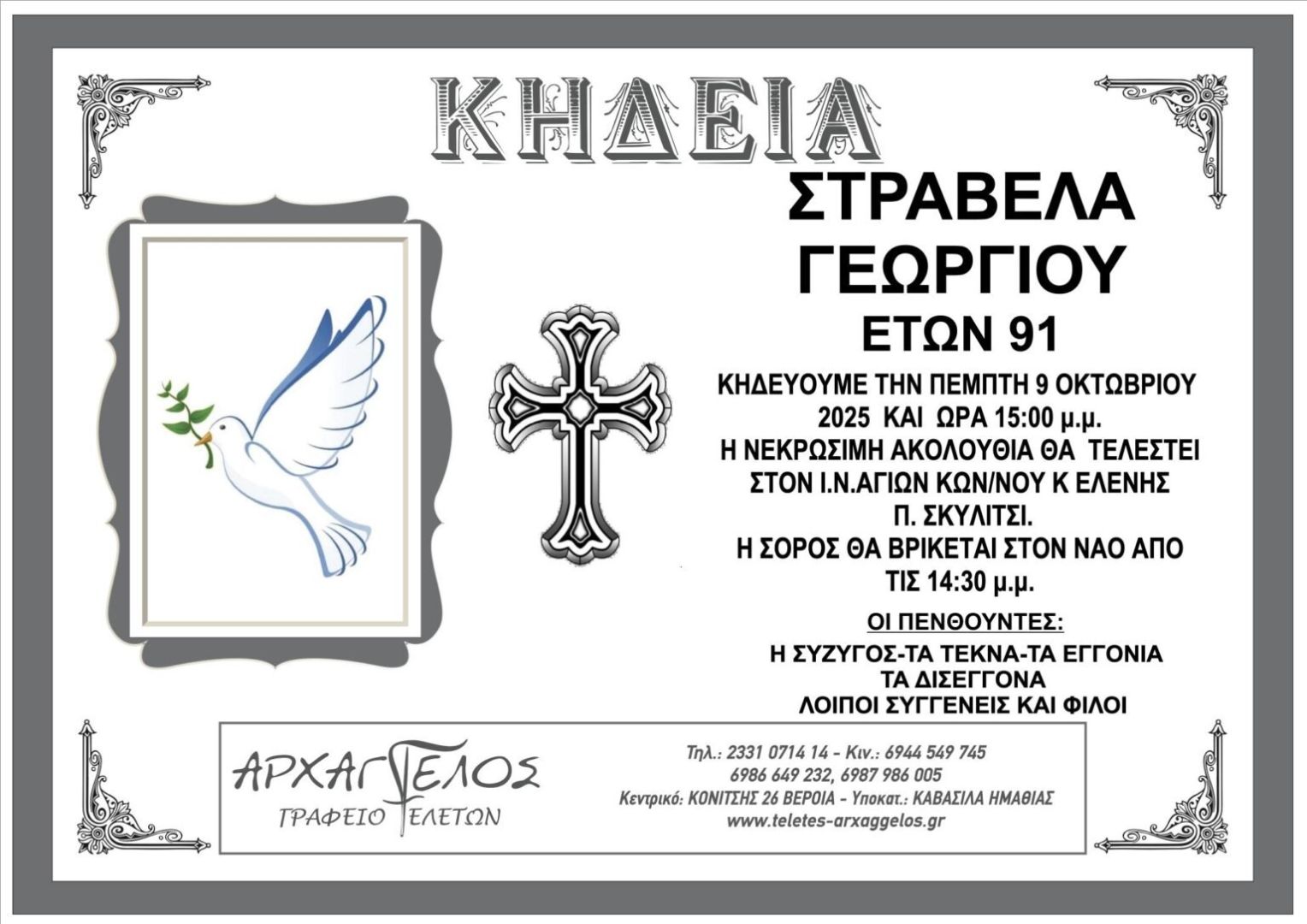 Έφυγε από τη ζωή και κηδεύτηκε σήμερα Πέμπτη 9 Οκτωβρίου 2025 στις 3.00 μ.μ. από τον Ιερό Ναό Αγίων Κων/νου και Ελένης Π. Σκυλίτσι ο Γεώργιος Στραβέλας σε ηλικία 91 ετών.