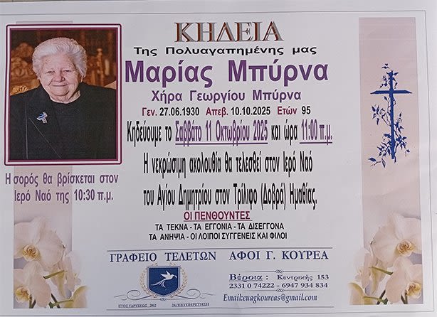 Έφυγε από τη ζωή και κηδεύεται το Σάββατο 11 Οκτωβρίου 2025 στις 11.00 π.μ. από τον Ιερό Ναό Αγίου Δημητρίου στον Τρίλοφο (Δοβρά) Ημαθίας η Μαρία Μπύρνα σε ηλικία 95 ετών.