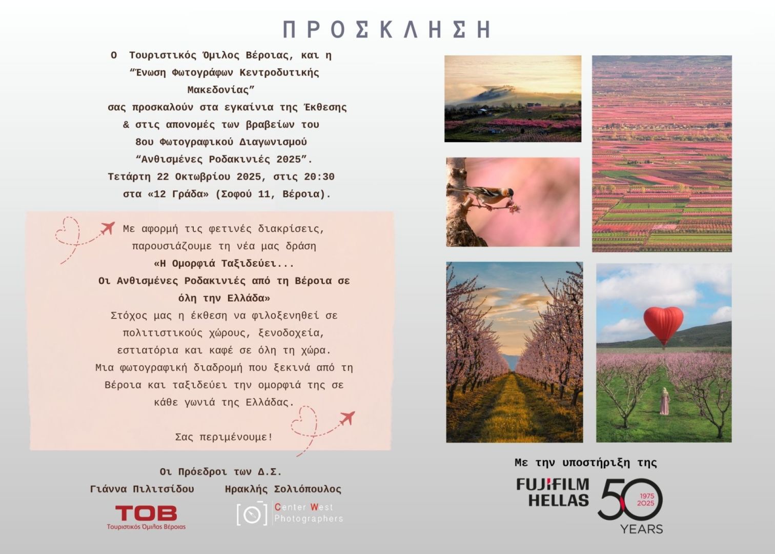 Ο «Τουριστικός Όμιλος Βέροιας», η «Ένωση Φωτογράφων Κεντρικής Δυτικής Μακεδονίας» και η «Fujifilm Hellas», σας προσκαλούν στην Έκθεση Φωτογραφίας και στις Απονομές των Βραβείων του 8ου Φωτογραφικού Διαγωνισμού «Ανθισμένες Ροδακινιές 2025», που θα πραγματοποιηθούν την Τετάρτη 22 Οκτωβρίου, στις 20:30, στο εστιατόριο «12 Γράδα» στη Βέροια.