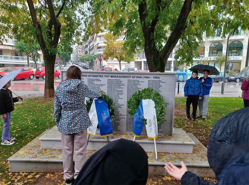 Ακολούθως οι μαθητές και οι μαθήτριες της Ε’ και ΣΤ’ τάξης συνοδευόμενοι από τους δασκάλους τους και τη Δ/ντρια κ. Όλγα Σαββίδου κατευθύνθηκαν (παρά τις άσχημες καιρικές συνθήκες από τη συνεχή βροχόπτωση) στο Μνημείο των Μακεδονομάχων της Βέροιας στην πλατεία των Αγίων Αναργύρων και κατέθεσαν δάφνινο στεφάνι, ενώ δεν παρέλειψαν να επισκεφθούν και τους ανδριάντες Μακεδονομάχων που υπάρχουν στον ευρύτερο χώρο όπως του Στέργιου Κουκουτέγου (Καπετάν Μπομπότα) και του δάσκαλου Εμμανουήλ Ζάχου.