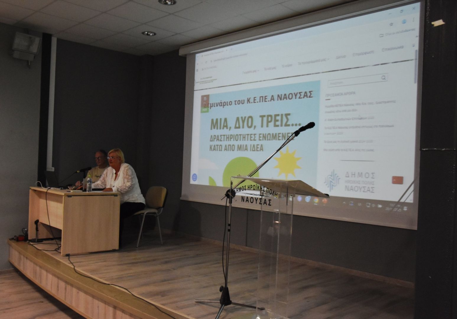 ο Κέντρο Εκπαίδευσης για το Περιβάλλον και την Αειφορία (Κ.Ε.ΠΕ.Α.) Νάουσας, σε συνεργασία με τη Διεύθυνση Δευτεροβάθμιας Εκπαίδευσης Ημαθίας και με την υποστήριξη του Δήμου Ηρωικής Πόλεως Νάουσας, συνδιοργάνωσε επιμορφωτικό σεμινάριο για τους εκπαιδευτικούς του Νομού Ημαθίας με τίτλο: «Μία, δύο, τρεις… δραστηριότητες ενωμένες κάτω από μία ιδέα».