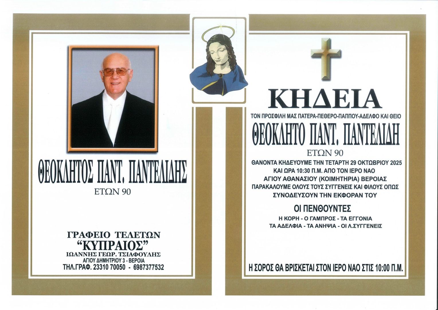 Έφυγε από τη ζωή και κηδεύεται την Τετάρτη 29 Οκτωβρίου 2025 στις 10.30 π.μ. από τον Ιερό Ναό Αγίου Αθανασίου (Κοιμητήρια) Βέροιας ο Θεόκλητος Παντ. Παντελίδης σε ηλικία 90 ετών.