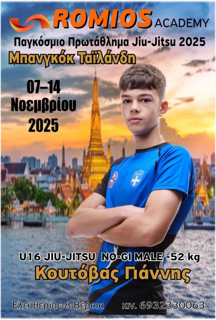 Κάθε μεγάλο επίτευγμα κρύβει πίσω του αμέτρητες ώρες δουλειάς, ιδρώτα και αφοσίωσης. Ο Κουτόβας Γιάννης, αθλητής του Α.Π.Σ.Ρωμιος είναι ζωντανή απόδειξη αυτού. Με ακούραστη προσπάθεια, πειθαρχία και αγάπη για το Jiu-Jitsu, κατάφερε να κερδίσει μία θέση στο Παγκόσμιο Πρωτάθλημα Jiu-Jitsu 2025, που θα διεξαχθεί στην Μπανγκόκ, Ταϊλάνδη, από 7 έως 14 Νοεμβρίου, στην κατηγορία U16 JIU-JITSU NO-GI MALE -52 kg.