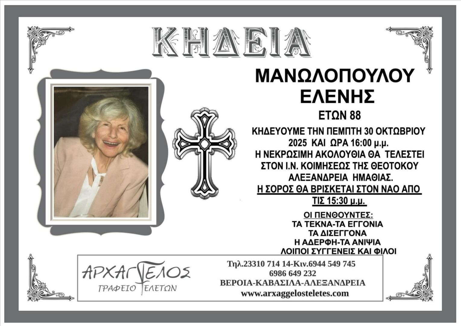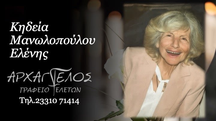 Έφυγε από τη ζωή και κηδεύεται την Πέμπτη 30 Οκτωβρίου 2025 στις 4.00 μ.μ. από τον Ιερό Ναό Κοιμήσεως της Θεοτόκου στην Αλεξάνδρεια Ημαθίας η Ελένη Μανωλοπούλου σε ηλικία 88 ετών.