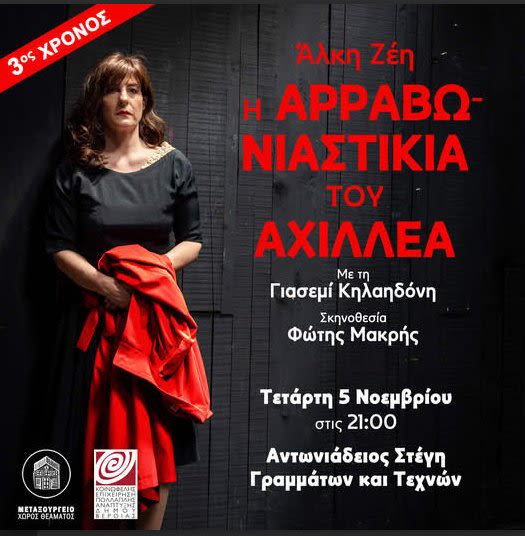 «Με λύπη μας σας ανακοινώνουμε ότι για τεχνικούς λόγους ματαιώνεται η προγραμματισμένη μας παράσταση «Η Αρραβωνιαστικιά του Αχιλλέα», που θα πραγματοποιούνταν την Τετάρτη 5 Νοεμβρίου στην Αντωνειάδιο Στέγη Γραμμάτων και Τεχνών Βέροιας.