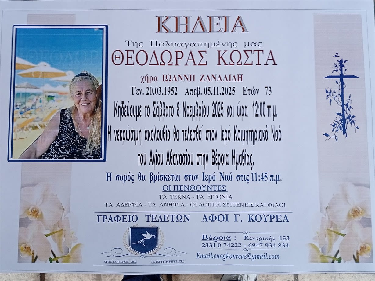 Έφυγε από τη ζωή και κηδεύεται το Σάββατο 8 Νοεμβρίου 2025 στις 12.00 μ.μ. από τον Ιερό Ναό Αγίου Αθανασίου (Κοιμητήρια) Βέροιας η Θεοδώρα Κώστα σε ηλικία 73 ετών.