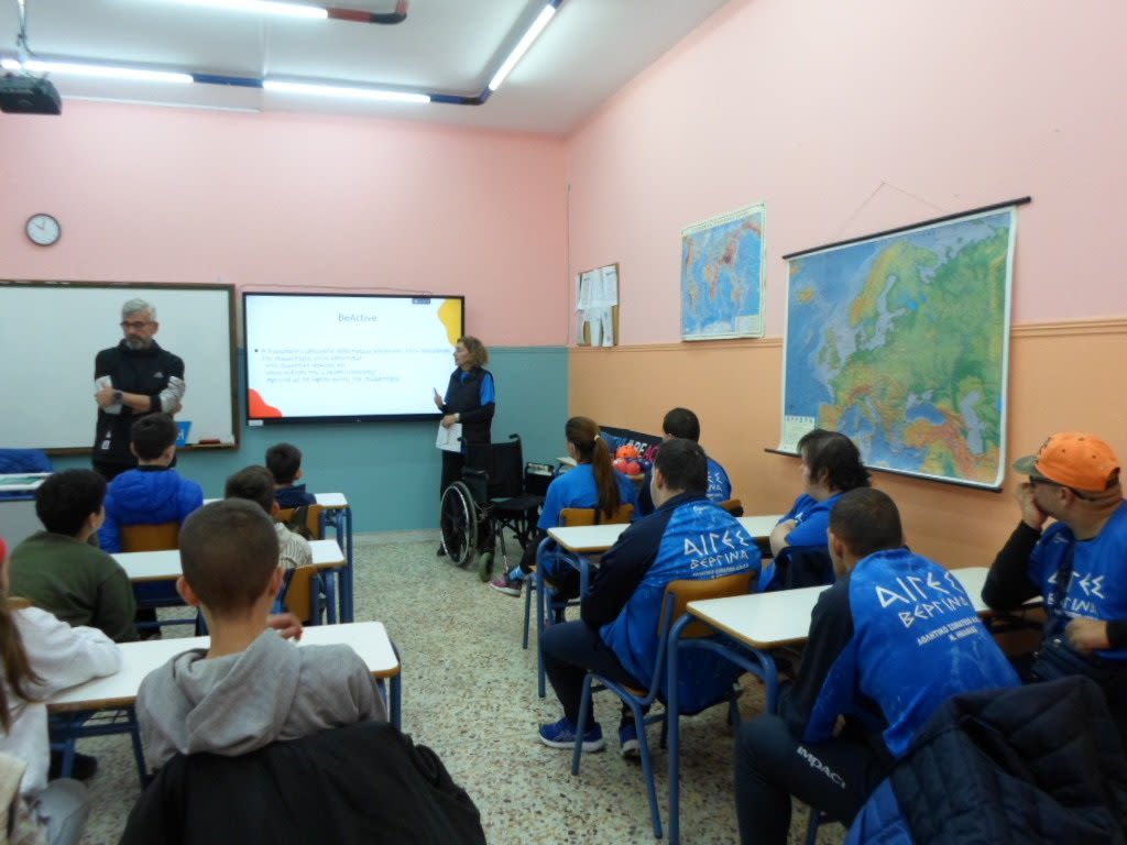 Την Πέμπτη 6 Νοεμβρίου οι μαθητές και οι μαθήτριες του Γυμνασίου Βεργίνας «Μανόλης Ανδρόνικος» είχαν την ευκαιρία να γνωριστούν και να συνεργαστούν με τα μέλη του Αθλητικού Σωματείου ΑμεΑ Ημαθίας «Αιγές Βεργίνα». Η επίσκεψη των αθλητών στο σχολείο εντάσσεται στο πλαίσιο της Δράσης Ενεργού Πολίτη με τίτλο «Η εκπαίδευση είναι για όλους: ευαισθητοποιούμαι για τα άτομα με αναπηρία» και υποστηρίζεται από το Ευρωπαϊκό Πρόγραμμα BeActive. Οι μαθητές/τριες ενημερώθηκαν για τους στόχους και τη λειτουργία του Σωματείου και υλοποίησαν από κοινού με τους αθλητές βιωματικές δραστηριότητες οι οποίες προάγουν την ενσυναίσθηση, τη συμπερίληψη, τον εθελοντισμό και την ενεργό πολιτειότητα. Η δράση αποτέλεσε πολύτιμη εμπειρία τόσο για τους μαθητές/τριες όσο και για τους/τις εκπαιδευτικούς. Ο Διευθυντής και ο Σύλλογος Διδασκόντων του σχολείου ευχαριστούν θερμά τους αθλητές και την πρόεδρο του Σωματείου, κυρία Καραγιάννη Έφη.