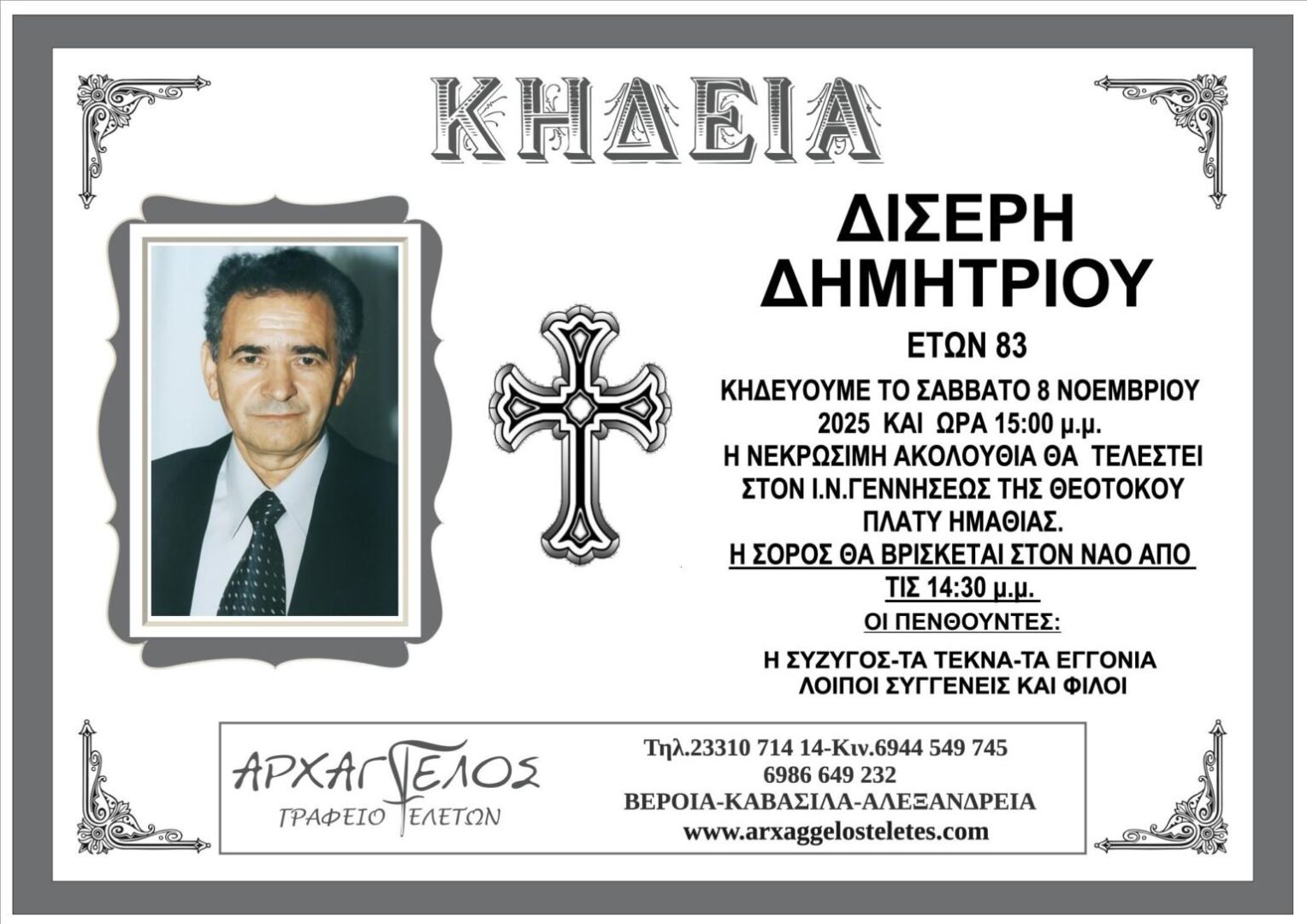 Έφυγε από τη ζωή και κηδεύτηκε σήμερα Σάββατο 8 Νοεμβρίου 2025 στις 3.00 μ.μ. από τον Ιερό Ναό Γεννήσεως της Θεοτόκου στο Πλατύ Ημαθίας ο Δημήτριος Δισερής σε ηλικία 83 ετών.
