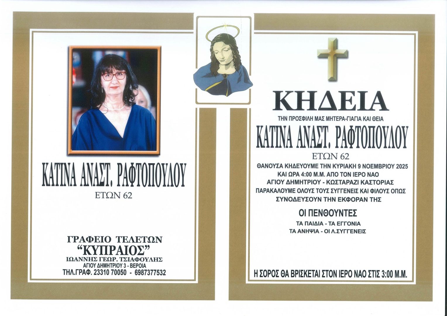 Έφυγε από τη ζωή και κηδεύεται την Κυριακή 9 Νοεμβρίου 2025 στις 4.00 μ.μ. από τον Ιερό Ναό Αγίου Δημητρίου Κωσταράζι Καστοριάς η Κατίνα Αναστ. Ραφτοπούλου σε ηλικία 62 ετών.