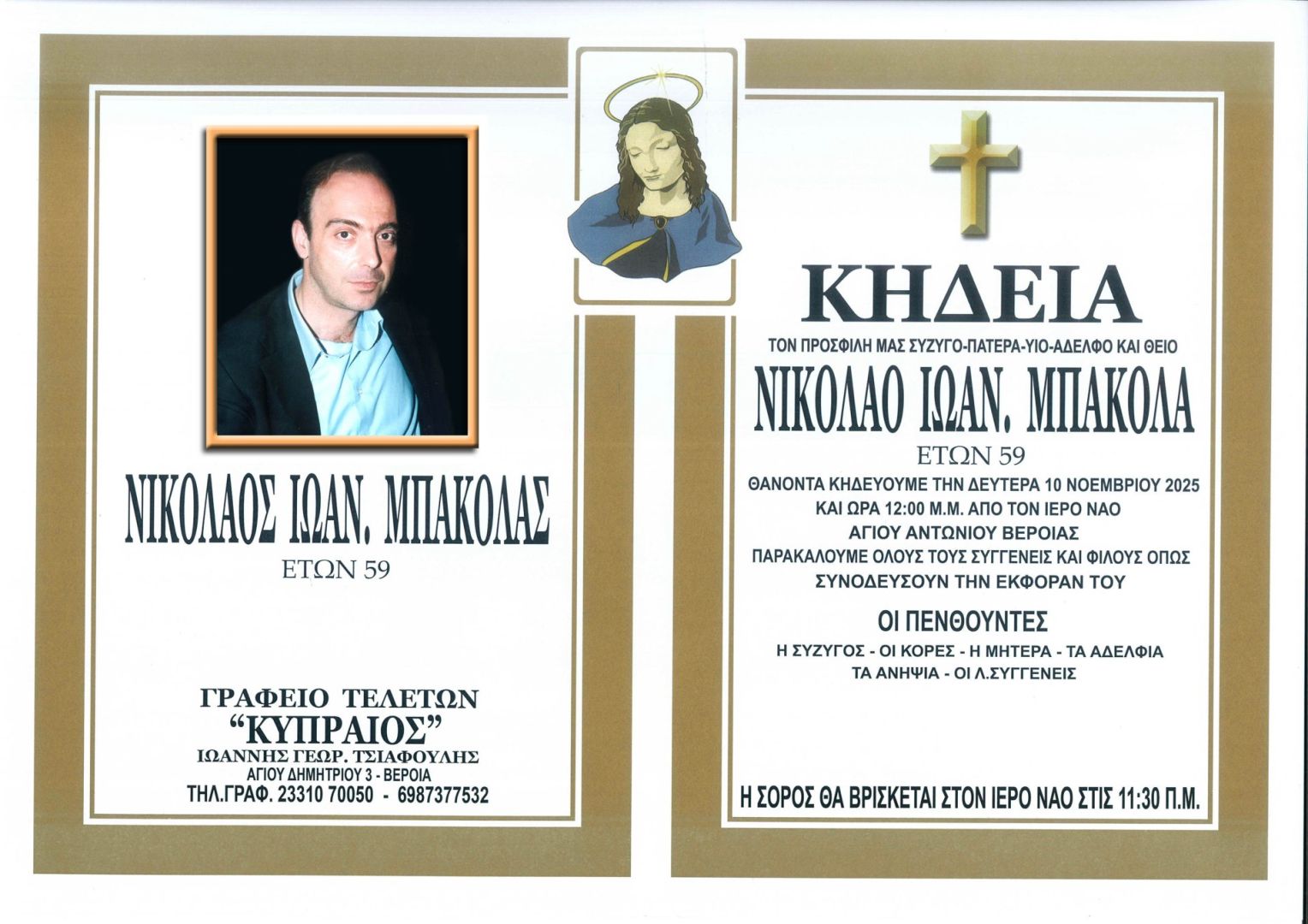Έφυγε από τη ζωή και κηδεύεται την Δευτέρα 10 Νοεμβρίου 2025 στις 12.00 μ.μ. από τον Ιερό Ναό Αγίου Αντωνίου Βέροιας ο Νικόλαος Ιωαν. Μπακόλας σε ηλικία 59 ετών.