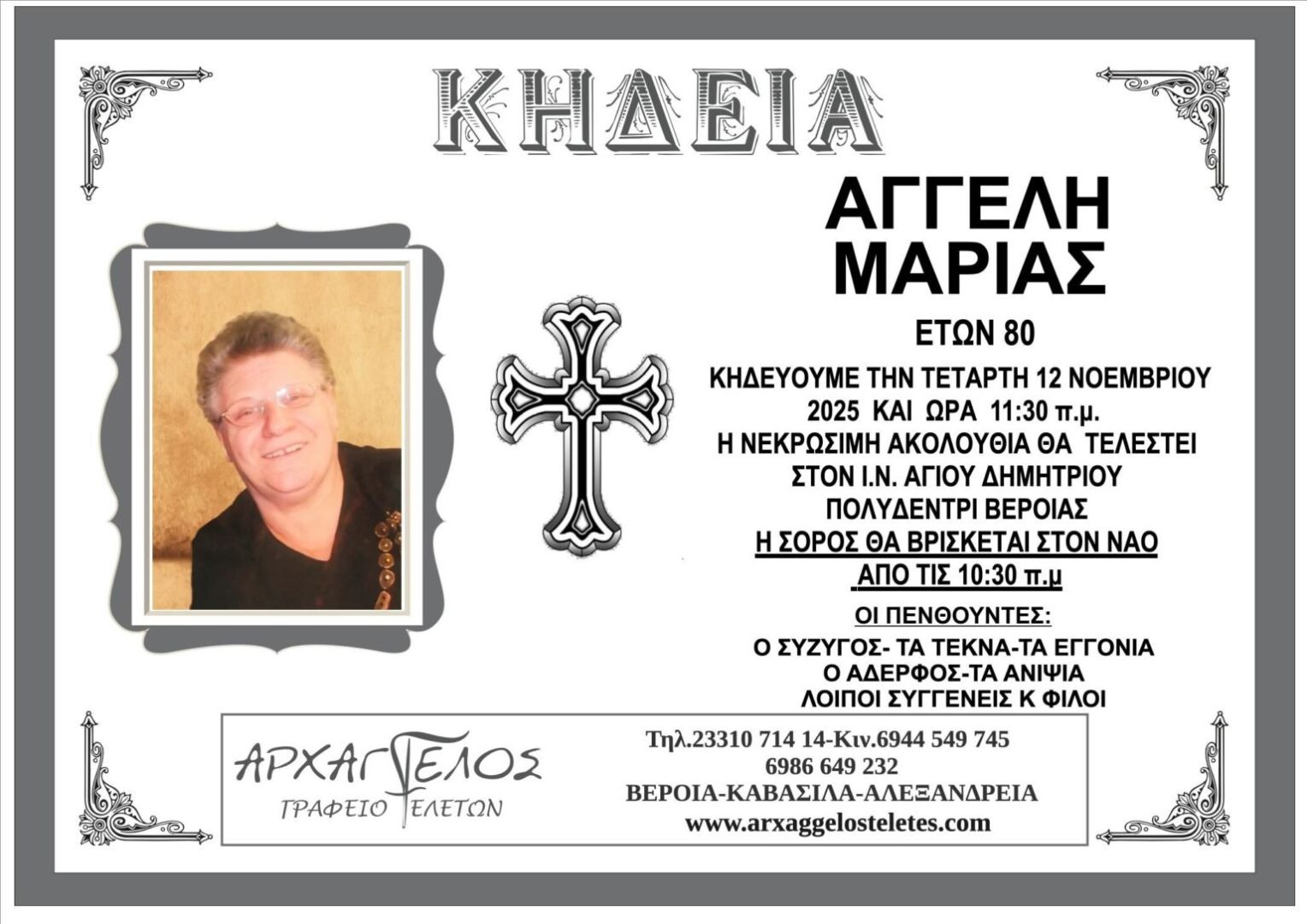Έφυγε από τη ζωή και κηδεύεται την Τετάρτη 12 Νοεμβρίου 2025 στις 11.30 π.μ. από τον Ιερό Ναό Αγίου Δημητρίου στο Πολυδένδρι Βέροιας η Μαρία Αγγελή σε ηλικία 80 ετών.