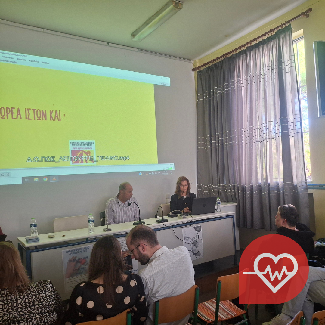 Η δεύτερη δράση αφορούσε στην επιμόρφωση των καθηγητών του σχολείου στην ΚΑΡΠΑ και στη χρήση αυτόματου εξωτερικού απινιδωτή. Εισηγητής ο κ. Σδόγκος Ευάγγελος, ιατρός καρδιολόγος. Η αμεσότητα και η μεταδοτικότητα του κατέστησαν εφικτό να αφομοιωθούν οι προσδοκώμενες γνώσεις.